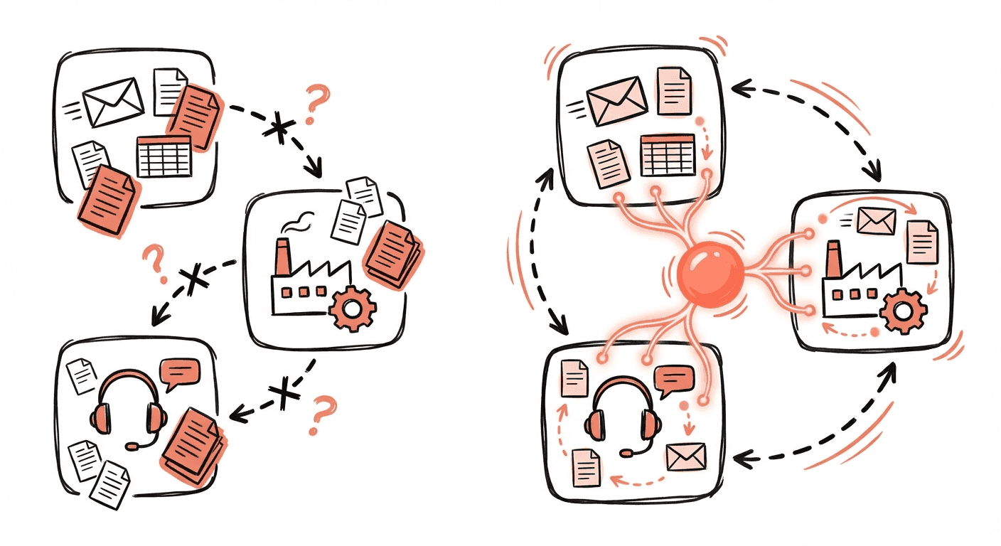 Growth creates complexity: As the business grows, those isolated automations crack. Customers expect Sales, Support, and Operations to share context. A one-dimensional bot can't help when a customer's issue involves logistics, billing, and support all at once.